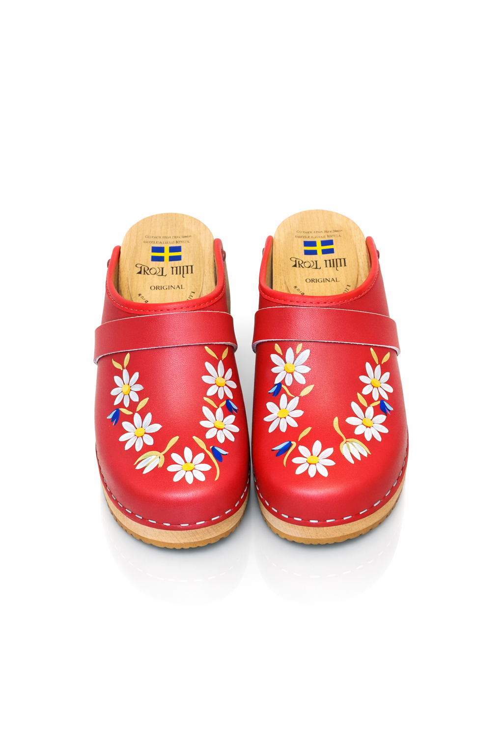 Handpainted with daisies and some bluebells. Orthopedic clog in red leather with bottoms of durable cultivated aldertree from Toffelmakaren.